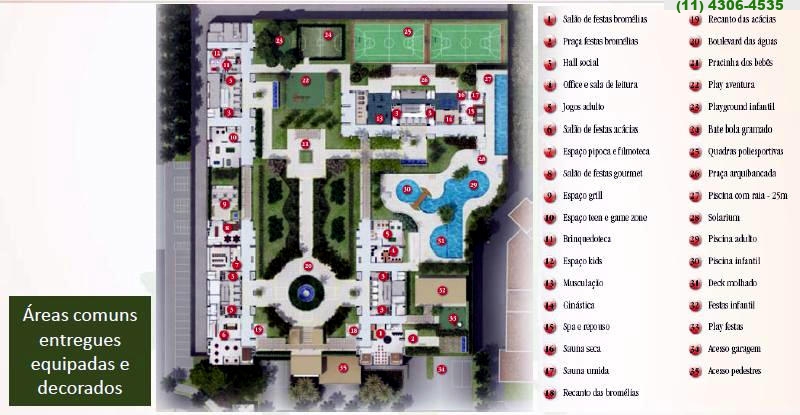 Descrição da área de lazer: academia, área de piscinas, áreas verdes, brinquedoteca, casa de boneca, Churrasqueira c/ forno de pizza, circuito de caminhada, deck molhado, espaço gourmet, espaço mulher, jardins, lan house, lounge, piscina, piscina coberta, praça de leitura, praça infantil, quadra poliesportiva, recreação coberta infantil, redário, sala de cinema, sala de ginástica, salão de festas infantil, salão de festas para adultos, salão de jogos, sauna, solarium, spa, trilha ecológica